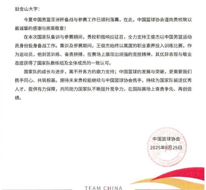 雷速體育10月16日訊 今日,中國(guó)籃協(xié)官方給舊金山大學(xué)發(fā)去一封感謝信,在信中對(duì)該大學(xué)培養(yǎng)球員王俊杰方面所付出的努力表達(dá)了高度認(rèn)可與感謝。