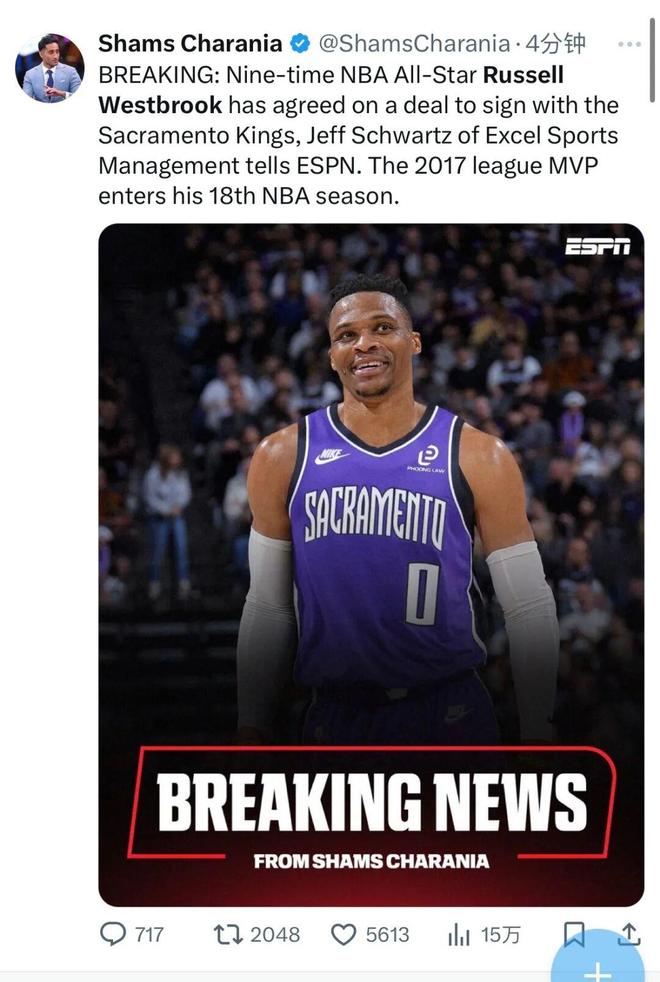 昨天深夜名記Shams的報(bào)道:九屆NBA全明星拉塞爾威斯布魯克已經(jīng)同意加盟國(guó)王,這位2017年的MVP即將開(kāi)啟生涯第18個(gè)賽季。