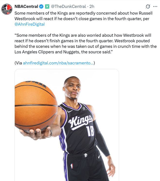 知名賬號NBACentral援引了記者AhnFireDigital的報(bào)道稱,盡管小薩博尼斯、德羅贊和拉文等核心球員都表示很高興能和威少一起打球,但一位聯(lián)盟消息人士告訴AhnFireDigital,國王隊(duì)內(nèi)并非所有人都對威少的加盟感到興奮。國王隊(duì)的一些隊(duì)員也擔(dān)心威少如果在第四節(jié)無法完成比賽會(huì)作何反應(yīng)。消息人士稱,在上賽季對陣洛杉磯快船隊(duì)和掘金隊(duì)的關(guān)鍵時(shí)刻被換下場后,威少在場下撅著嘴很不高興。