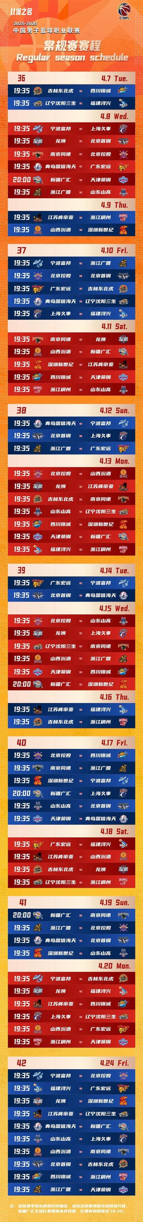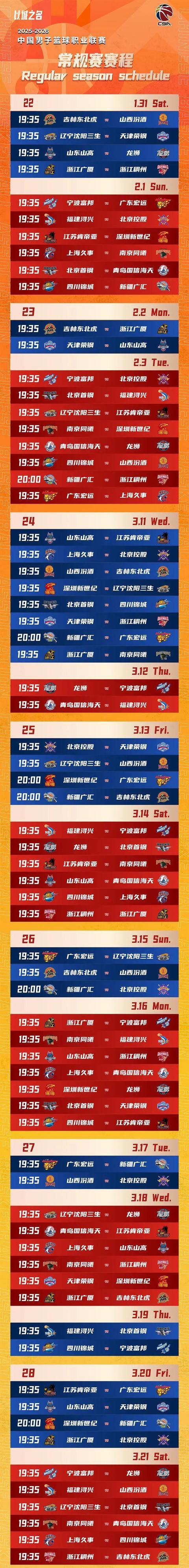 北京時間10月20日,CBA官方公布了2025-2026賽季CBA聯(lián)賽常規(guī)賽賽程,新賽季的CBA將于12月12日開賽,次年4月24日收官,具體賽程公布如下。(注:由于目前新賽季球隊全簡稱尚未確定,對陣表中球隊名稱暫用俱樂部簡稱代替。)