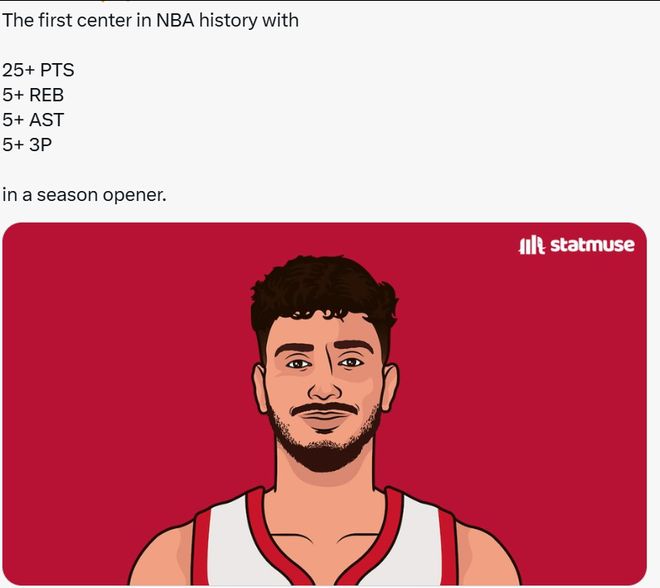 第三,申京是NBA歷史上首個能夠在揭幕戰(zhàn)中單場轟下至少25分5籃板5助攻外加5記三分球的中鋒。