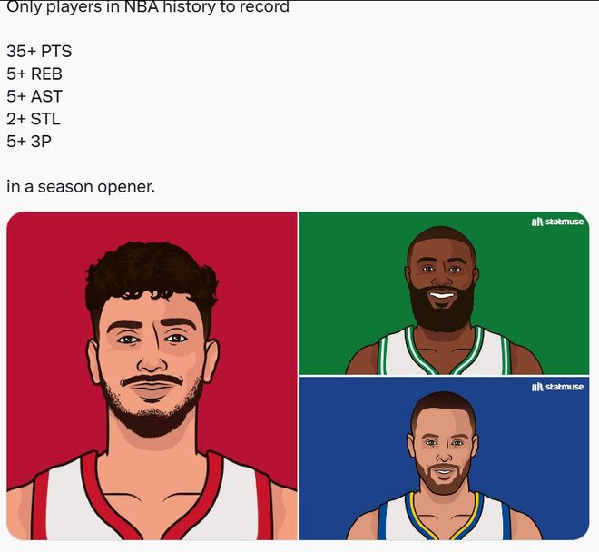 第四,申京是第三位能夠在揭幕戰(zhàn)中單場轟下至少35分5籃板5助攻2搶斷外加5記三分球的球員,另外兩人分別是庫里和杰倫-布朗。