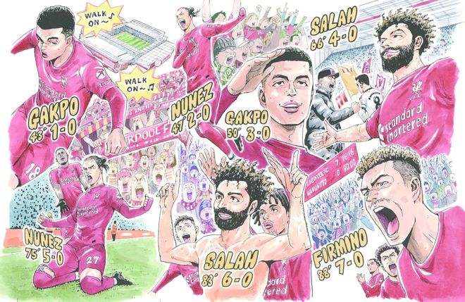 講談社正式發(fā)布了一幅特別漫畫作品,定格了利物浦隊史對陣曼聯(lián)的最大比分勝利瞬間。2023年3月,在英超聯(lián)賽的一場較量中,利物浦在安菲爾德球場以7-0的懸殊比分擊敗死敵曼聯(lián),震驚足壇。