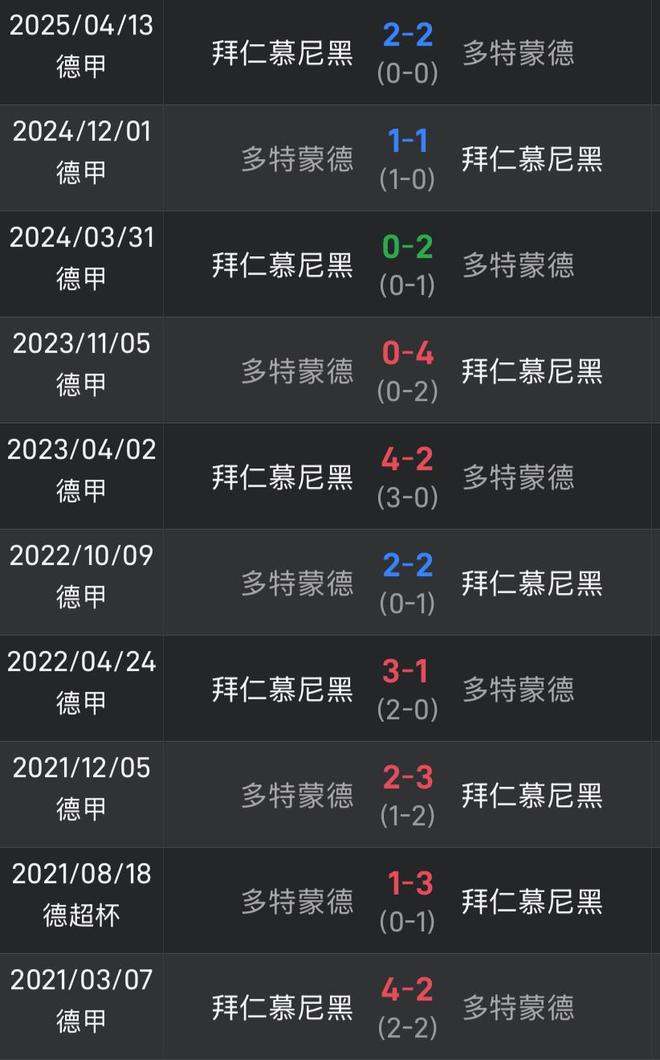 此外,雙方近10次各項(xiàng)賽事交鋒,拜仁占據(jù)上風(fēng),取得6勝3平1負(fù)的戰(zhàn)績(jī)。數(shù)據(jù)顯示,自2021年3月以來(lái),在雙方的10次碰撞中,多特僅贏下1場(chǎng)。