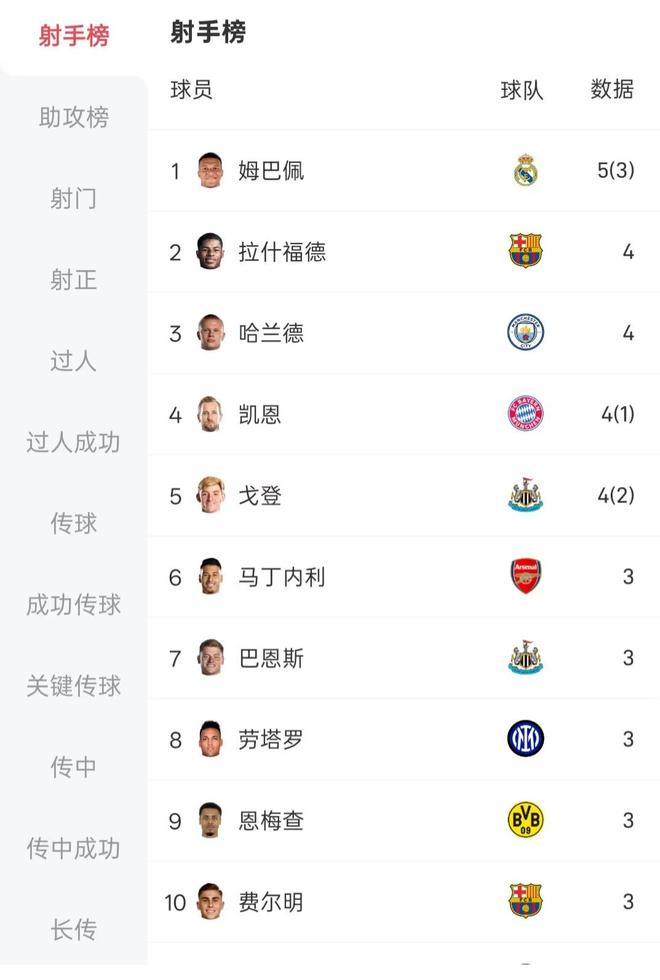 本賽季歐冠射手榜:姆巴佩5球居首,拉師傅&哈蘭德4球緊隨